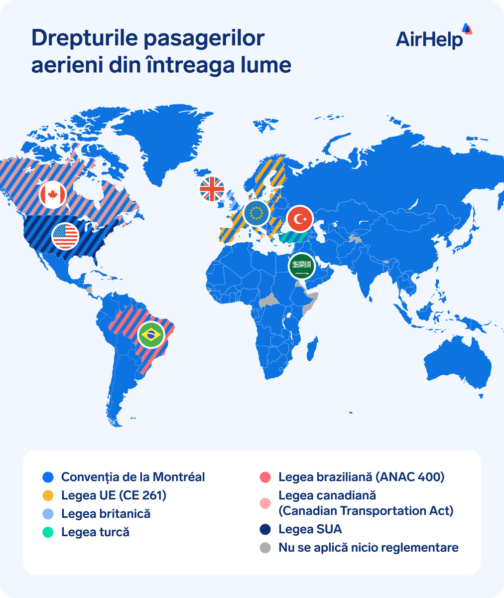 Deși fiecare țară are propriile legi, există și reguli internaționale importante care îi ajută pe pasagerii aerieni să își cunoască și protejeze drepturile. Acestea includ, dar nu se limitează la, legislația UE 2626, diverse legi ale SUA și Convenția de la Montreal.